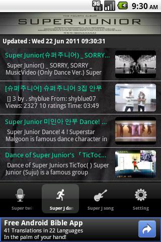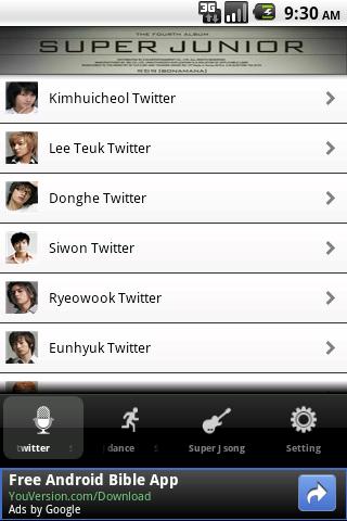 Aplikasi Android Super Junior ini akan merangkum setiap tweet-tweet mereka dan Anda hanya tinggal memilih akun Twitter siapa yang ingin Anda lihat, apakah Lee Teuk, Siwon, Yesung atau anggota Super Junior lainnya.